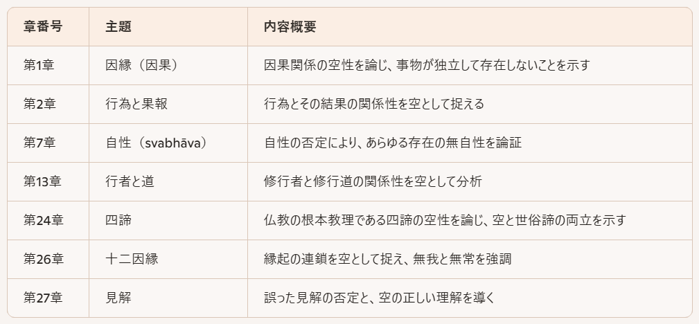 ⇒ナーガールジュナ(龍樹)によって著された中観派の根本的な哲学書であり、仏教思想における「空(śūnyatā)」の概念を体系的に論じたものです。以下にその構成と主要な内容を簡潔にまとめます。