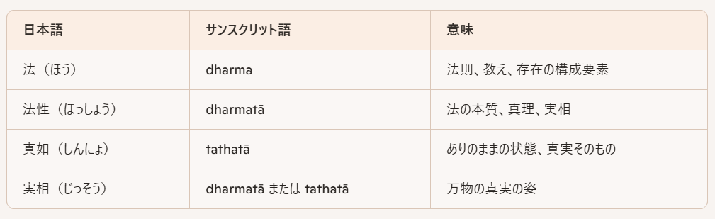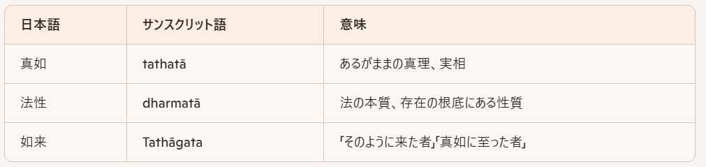 ⇒これも法性、真如と同義語で、諸法実相の異名である、空の同義語であるともされる。