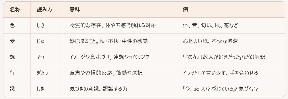 ■五蘊:仏教の核心的な教えのひとつで、「私とは何か?」という問いに対する釈迦の答えでもあります。わかりやすく言えば、私たちの心と体の働きを五つのグループに分けて説明したものです。