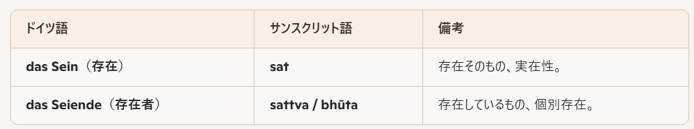 ハイデッガーが「das Seiende」を「存在しているもの」として「存在そのもの(Sein)」と区別したように、サンスクリットでも sat(存在)と sattva(存在者)を区別することができます。