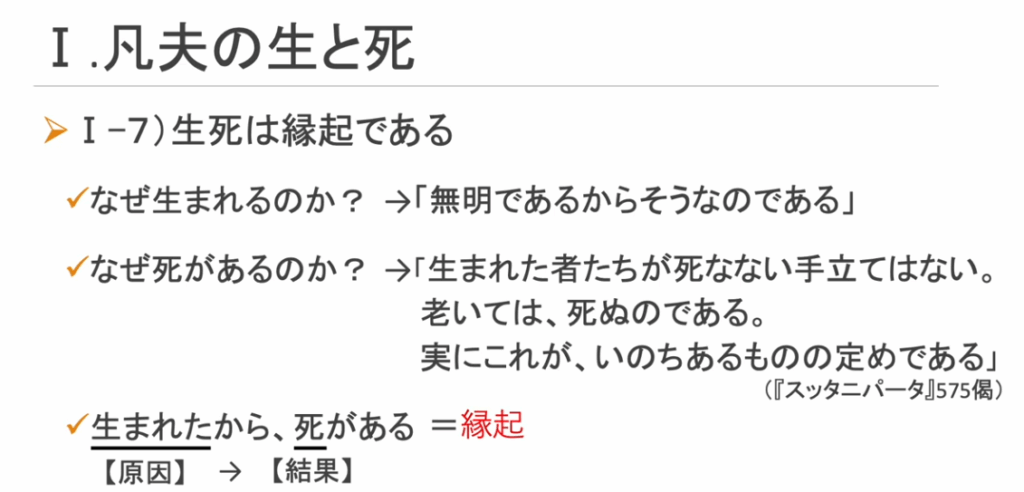 ⇒その生存はすなわち五つの構成要素(五陰:ごおん)である。生存から<生>が生ずる。老死、苦等、憂、悲、悩、失望ーこれらは<生>から生ずる。このようにして、このたん〔に妄想のみ〕なる苦しみのあつまり〔苦陰:くおん〕が生ずるのである」(第八詩・第九詩)