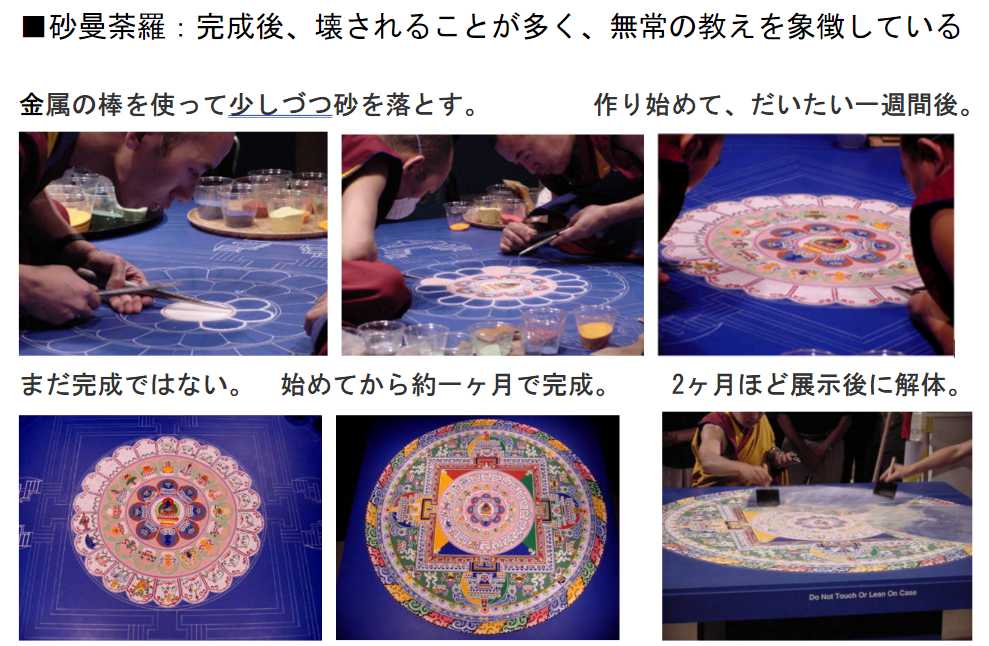 - 曼荼羅と儀式:チベット仏教では、曼荼羅や儀式が重要な役割を果たす。これらの修行の一環として行われ、視覚的にも精神的にも深い意味を持っている。