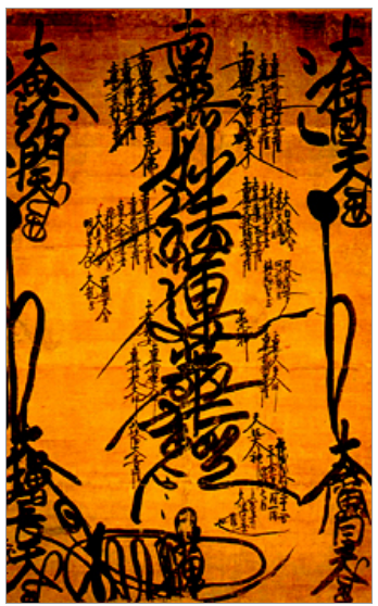 中央の文字は、法華経宇宙を象徴する「南無妙法蓮華経」という題目