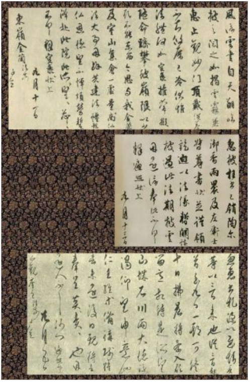 2通目は最澄がお香などを送ったことへの返礼である。最近は忙しいけれど法要がおわったら、あなたの送ってきた左衛士(さえじ)の督(かみ)の手紙を読みますというもの、書風は覇気に充ちている。3通目は空海から最澄にお香などを送ったこと、『仁王経』を借りたいというお申し越しについては、いまは別用で使っているので後日お貸ししましょうということなどを綴る。こちらは鮮やかな草体を見せている。