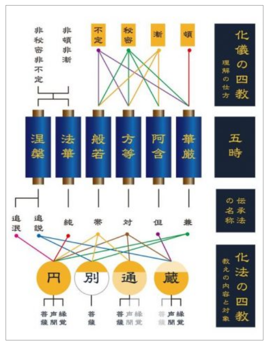「五時」とは、教化方法などを判釈した順序に従って、華厳・阿含・方等・般若・法華涅槃の五期に分類したものである。「八教」は、理解の仕方で分類された「化儀の四教」と、教えの内容と対象を示した「化法の四教」を指す。例えば「化儀の四教」の「頓」は一瞬で理解することで、「漸」は段階を経ての理解にあたる。また「化法の四教」の「蔵」は、二乗(声聞と縁覚)の教えであり、「別」は菩薩乗の教えを示した。