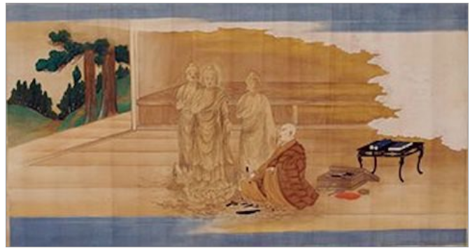 図版は『伝教大師絵伝』(延暦寺蔵)で、最澄が自刻の薬師如来像を一乗止観院に安置した様子が描かれている。