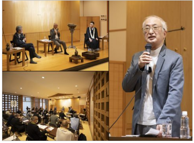 三井寺で開催された近江 ARS「還生の会(げんしょうのかい)」第1回で、末木さんが講義をしている様子(右)。後半では松岡と三井寺長吏・福家俊彦さんとともに鼎談や田中優子さんその他との質疑もおこなわれた。(左)。